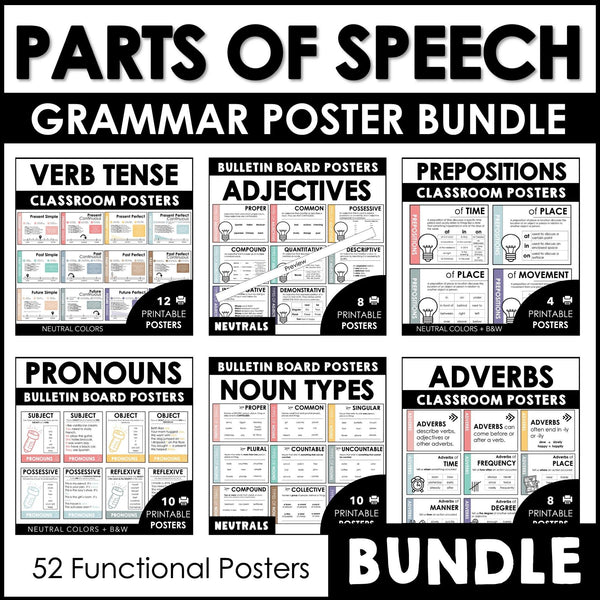 Brighten your classroom with functional grammar posters that support learning and look great on your walls. These ESL-friendly poster sets include visuals for parts of speech, verb tenses, and conversation starters—perfect for reinforcing key grammar concepts through passive exposure. Ideal for any ELA or ESL classroom, these posters combine grammar instruction with colorful, organized decor to make your learning space both educational and inviting.