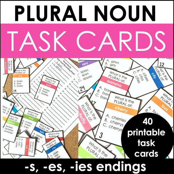 Plural Noun Task Cards | Spelling Patterns -s, -es, -ies endings