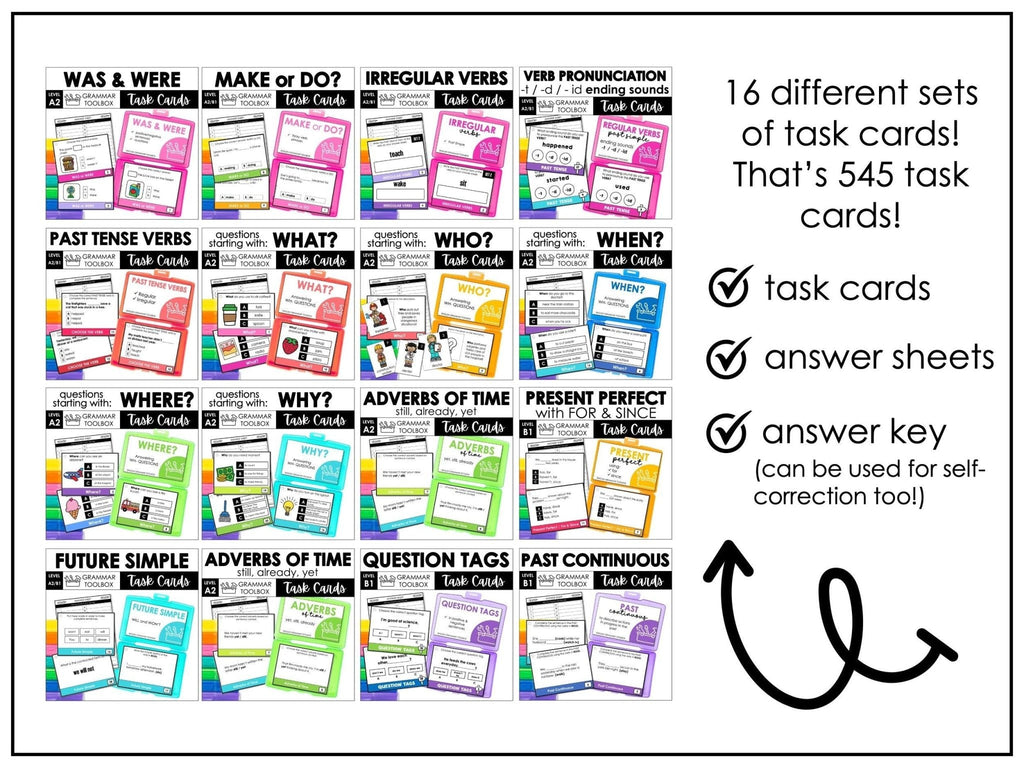 - Over 545 grammar task cards targeting specific elementary ESL grammar concepts