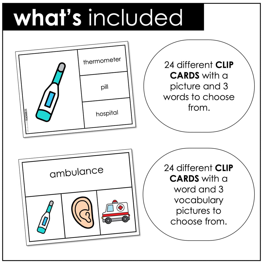 Teach essential health and body vocabulary with 24 interactive clip cards. Perfect for ESL/ELL learners, kindergarten through 2nd grade, and health units, these cards make learning medical and body-related words hands-on and engaging. Use them in centers, small groups, or independent practice to build spelling, recognition, and oral language skills.