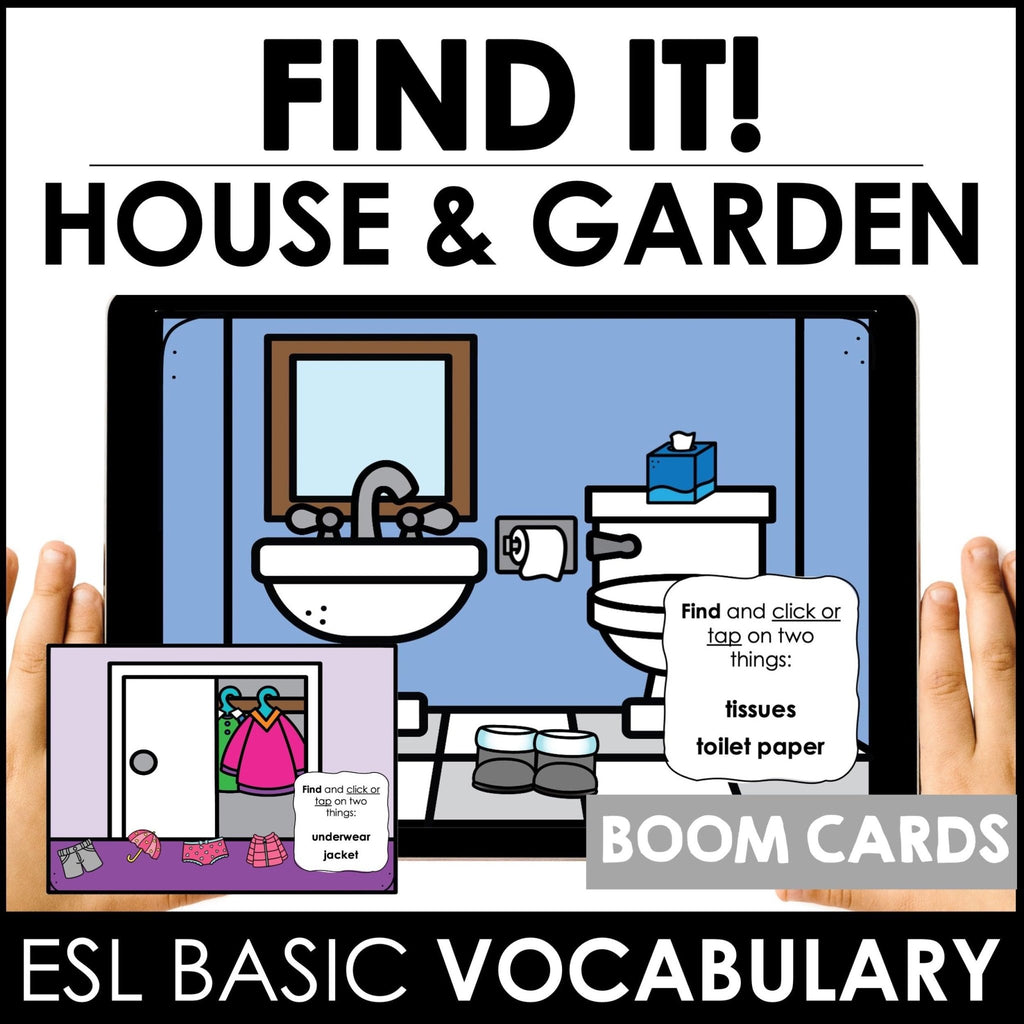 Help your ESL students identify and practice basic house and garden vocabulary with this fun digital Boom Cards™ set! Students locate and click on the correct objects in each scene, reinforcing word–picture connections while developing vocabulary and comprehension skills. Ideal for beginners, this interactive resource helps students learn common items found in the bedroom, living room, bathroom, and garden.