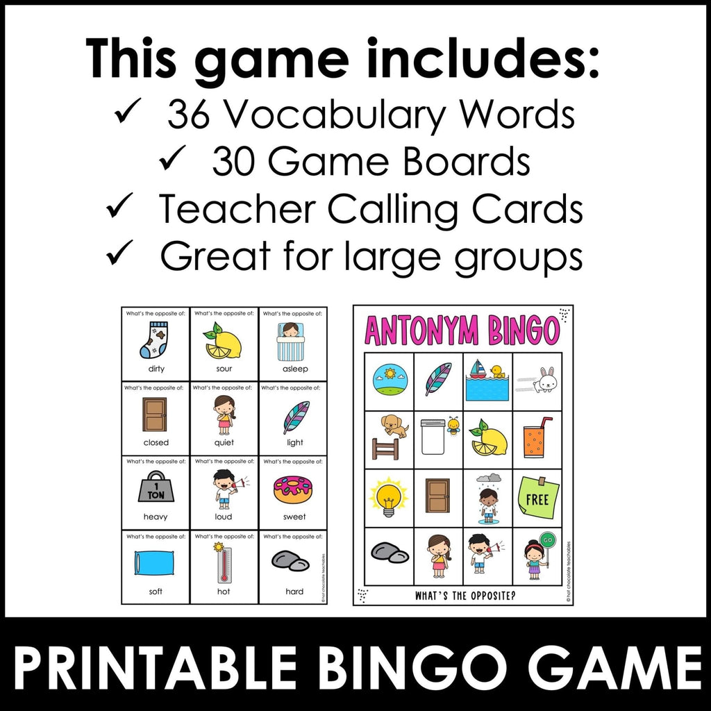 This antonyms bingo game is a fun and engaging way to practice and review 36 opposite words. Students will love playing this colorful game while building vocabulary and reinforcing word meanings. Playing games is one of the best ways to help students master new concepts while keeping them motivated and focused.