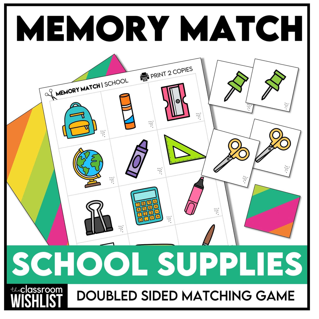 - Print two copies of the school supplies memory sheet.