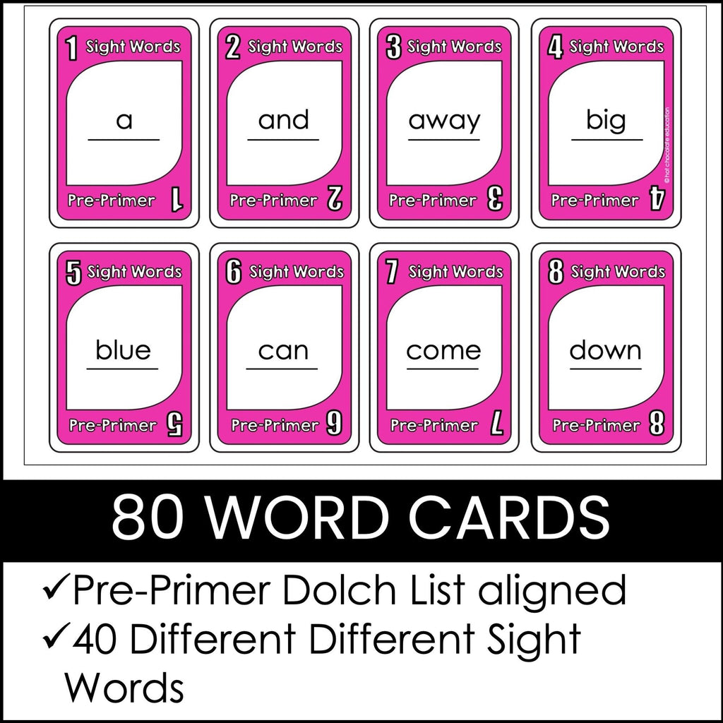 - 80 Sight Word Cards featuring 40 Dolch Pre-Primer words (each word appears twice)