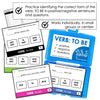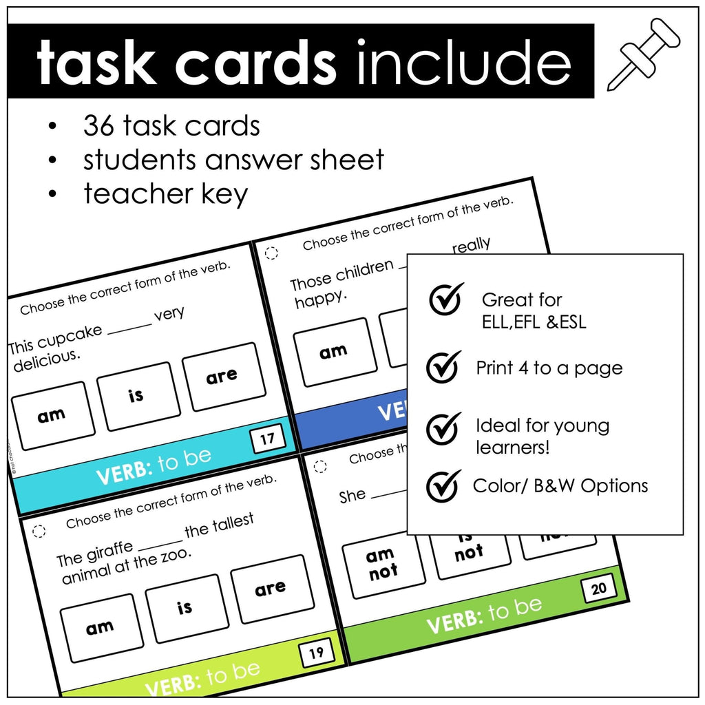 Give your students the practice they need with subject-verb agreement using the verb TO BE in the Present Simple tense. This set of grammar task cards helps learners master AM, IS, and ARE in positive and negative sentences as well as questions. Designed for ESL, EFL, and ELL students, these cards are perfect for reinforcing grammar rules in a fun and interactive way.